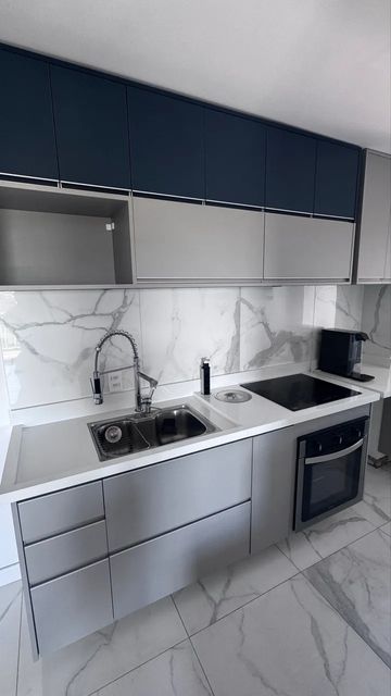 Cozinha americana planejada, incluso cooktop de indução e forno, área de serviço com sacada