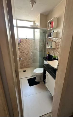 Banheiro Funcional: Planejado com gabinete sob medida, bancada em granito escuro, box em vidro temperado (blindex) e nichos aéreos.