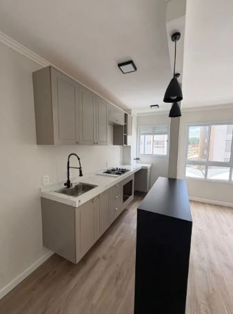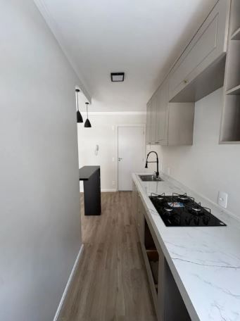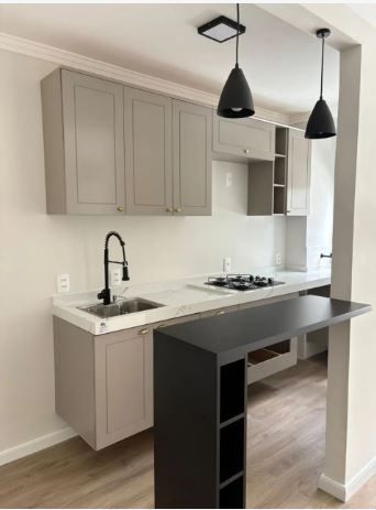 Cozinha Provençal Americana Planejada: Armários em tom cinza fendi com puxadores dourados, bancada extensiva em quartzo branco marmorizado, cooktop embutido e torneira monocomando preta fosca estilo gourmet.