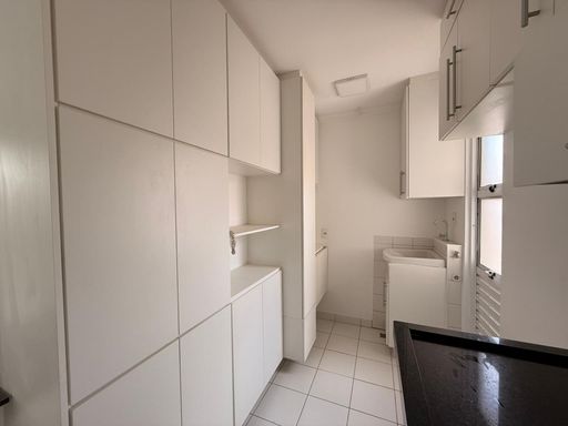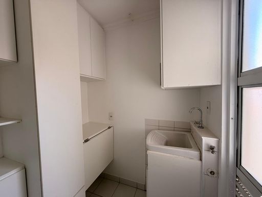 Cozinha Planejada: Repleta de armários brancos (high gloss), bancada em granito escuro e lavanderia integrada de forma discreta.