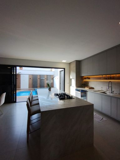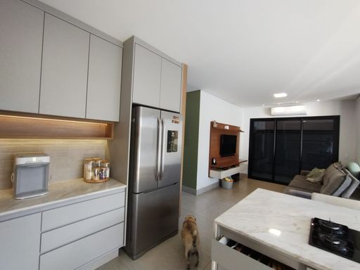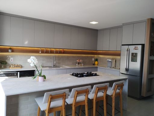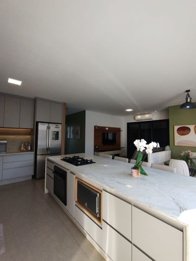 Cozinha americana totalmente integrada com churrasqueira e equipada.