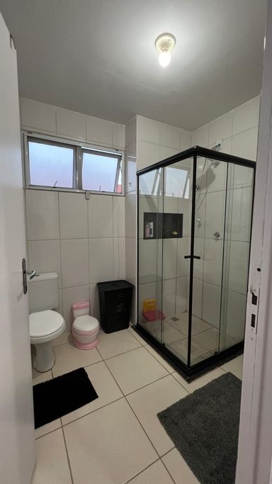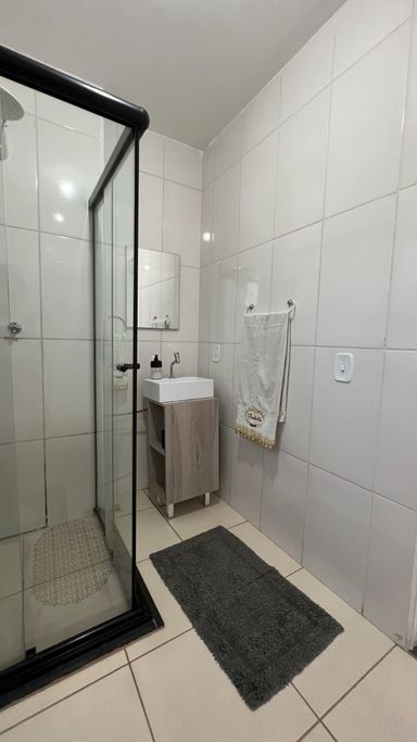 Banheiro com gabinete e box de blindex