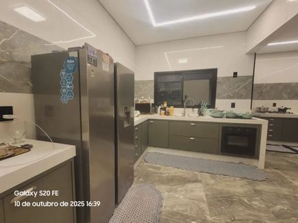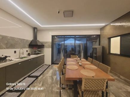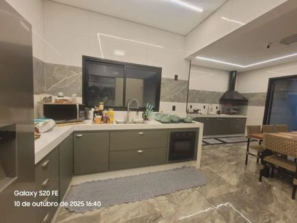 Ampla cozinha planejada, integrada a área gourmet com churrasqueira